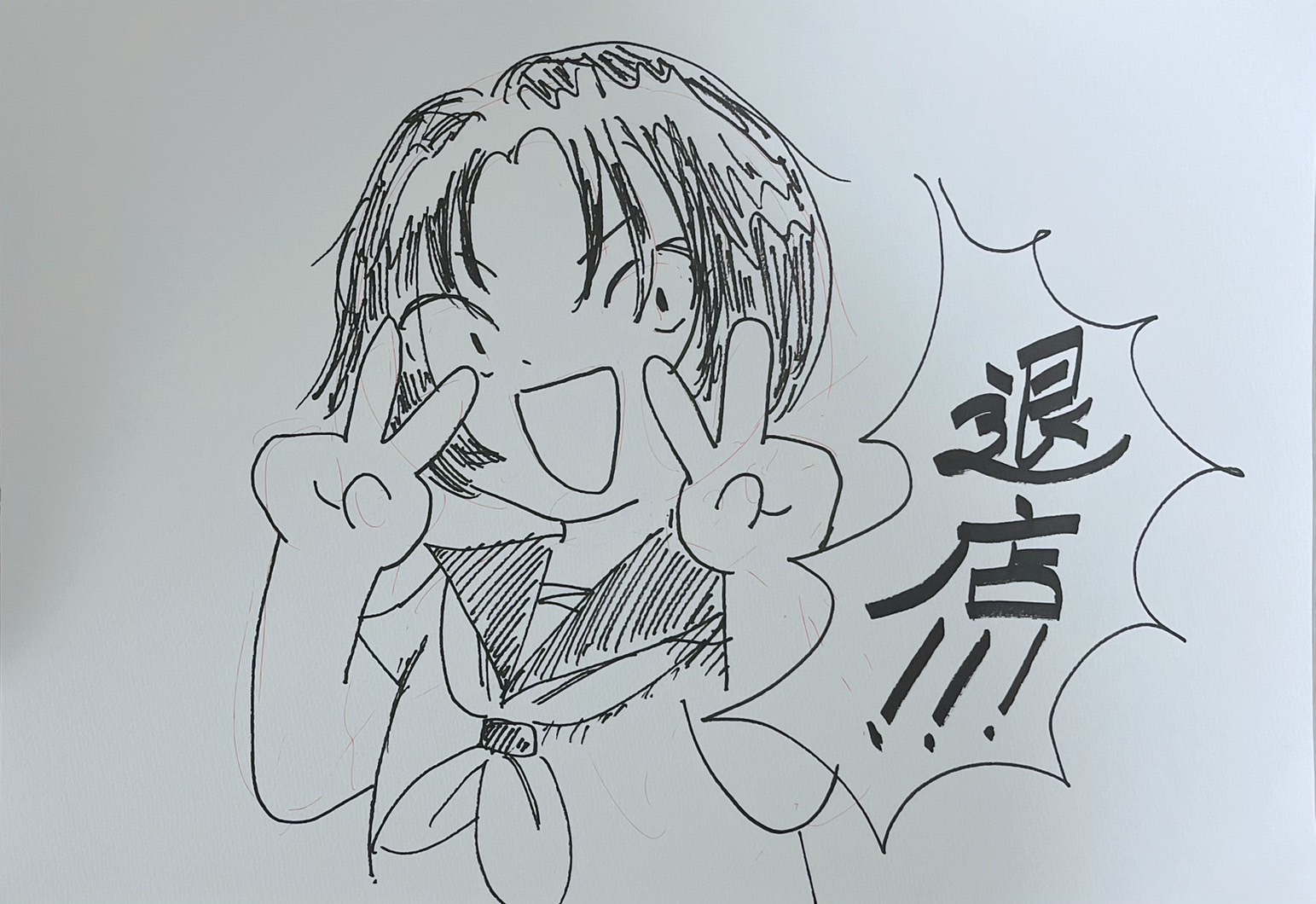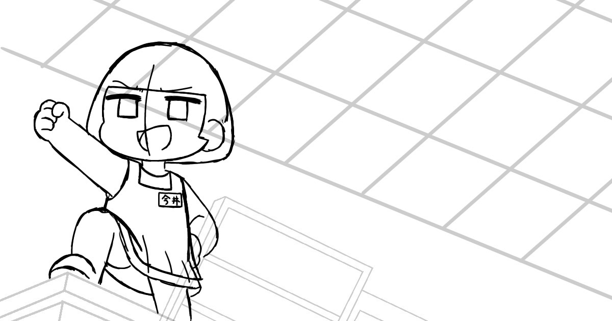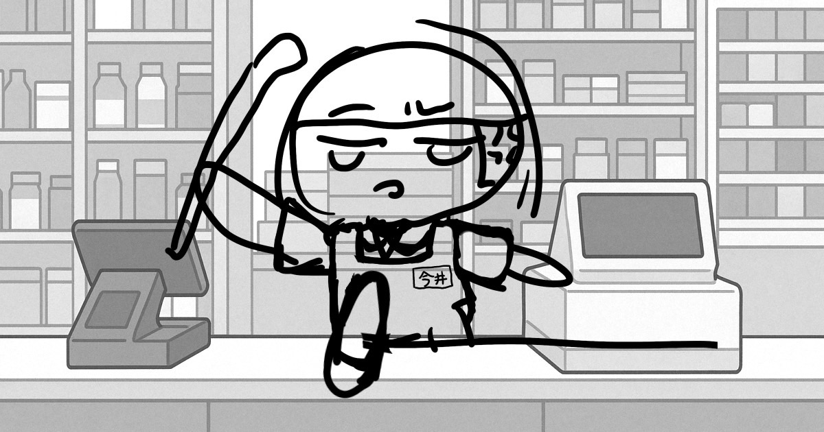 サムネの没ラフ案可愛いので全人類見てください。最初はブチ切れ店員今井を迷惑客目線で体験出来る構図でした。レジカウンター乗り越えてこようとするのやめろ。